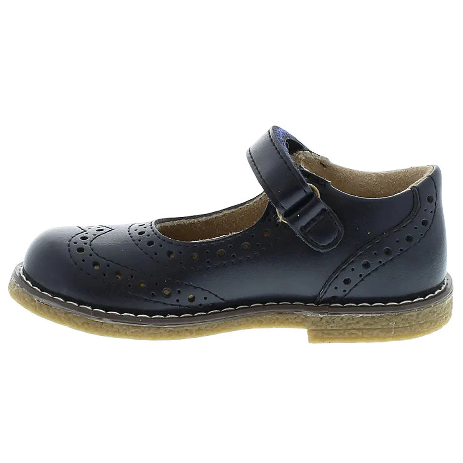 Leather Mary Jane featuring hook-and-loop ankle strap with decorative brogue perf design on vamp, throat, and heel. Offered in matte colors; sizes ranging from 7.0 toddler - 3.0 youth.