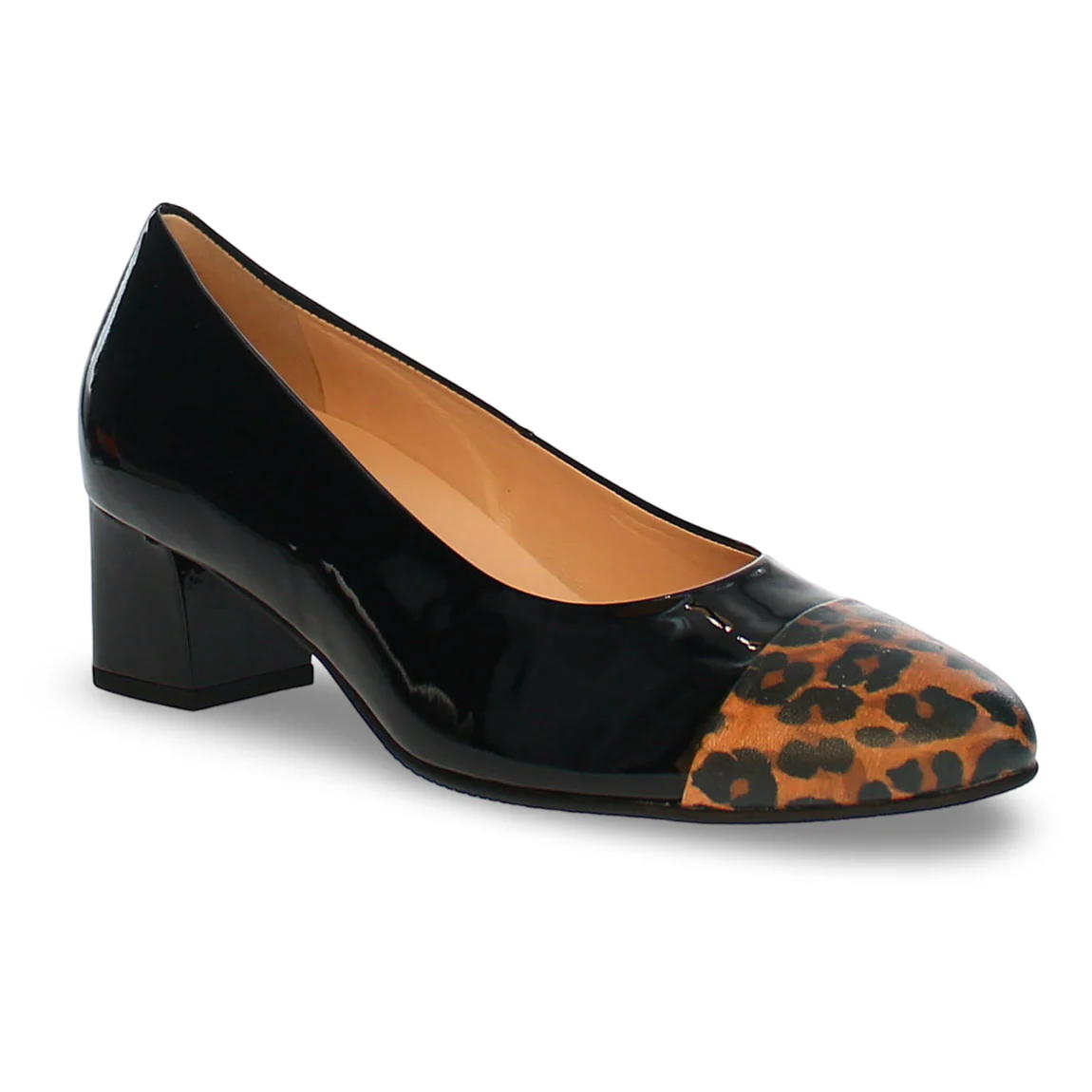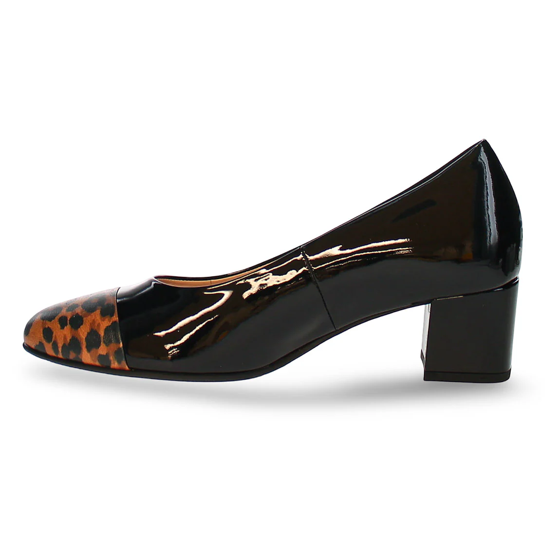 A feminine eye-catcher, the HASSIA RAVENNA pump enchants with its combination of black patent leather and a leopard-print toe cap. The elegant look is completed by a tonal block heel, which provides excellent stability thanks to its slip-resistant sole. Designed in width H, it offers a comfortable fit for average foot widths, while the premium leather lining ensures exceptional wearing comfort. A modern highlight for a business suit at the office or an evening event – the RAVENNA women’s shoe effortlessly combines comfort and style.