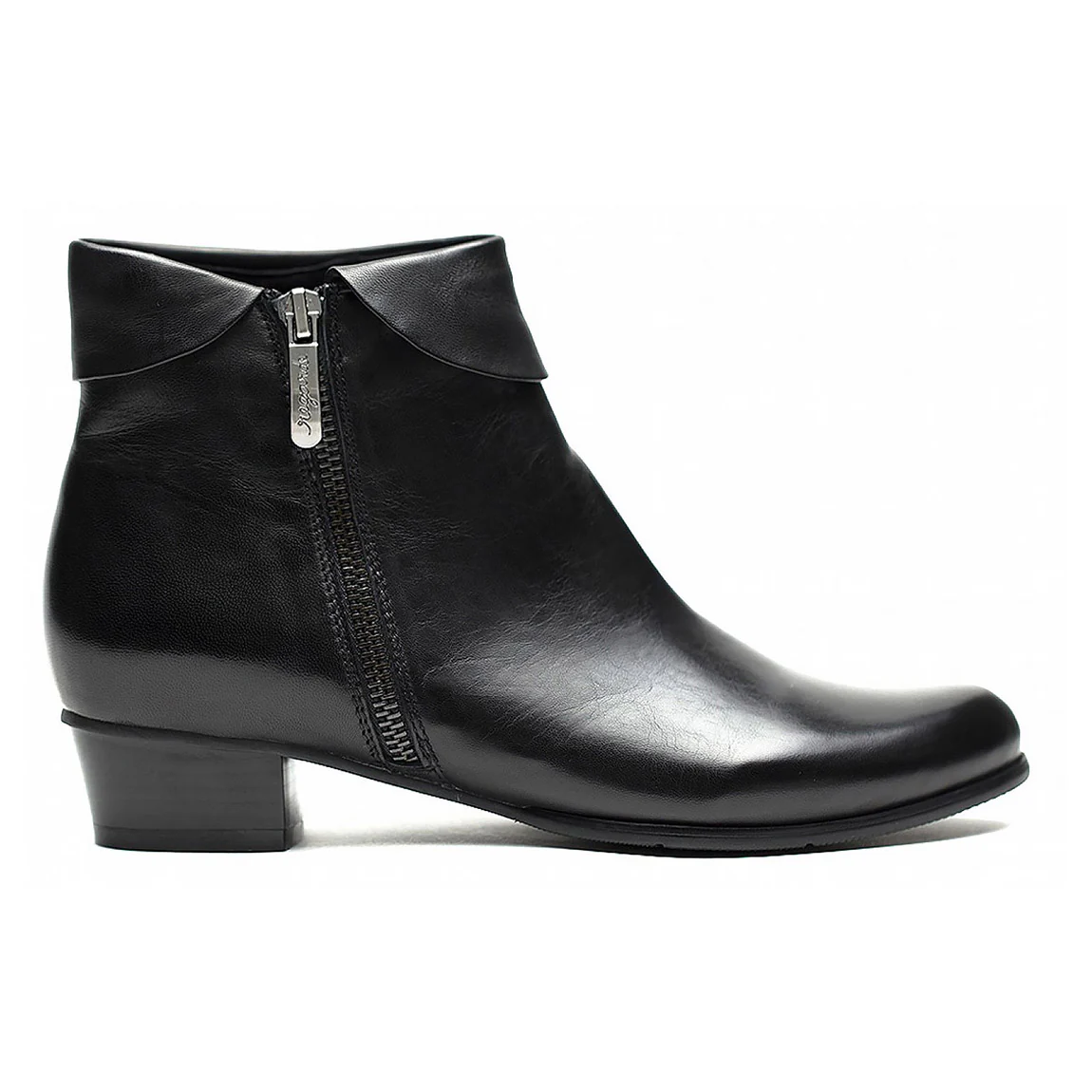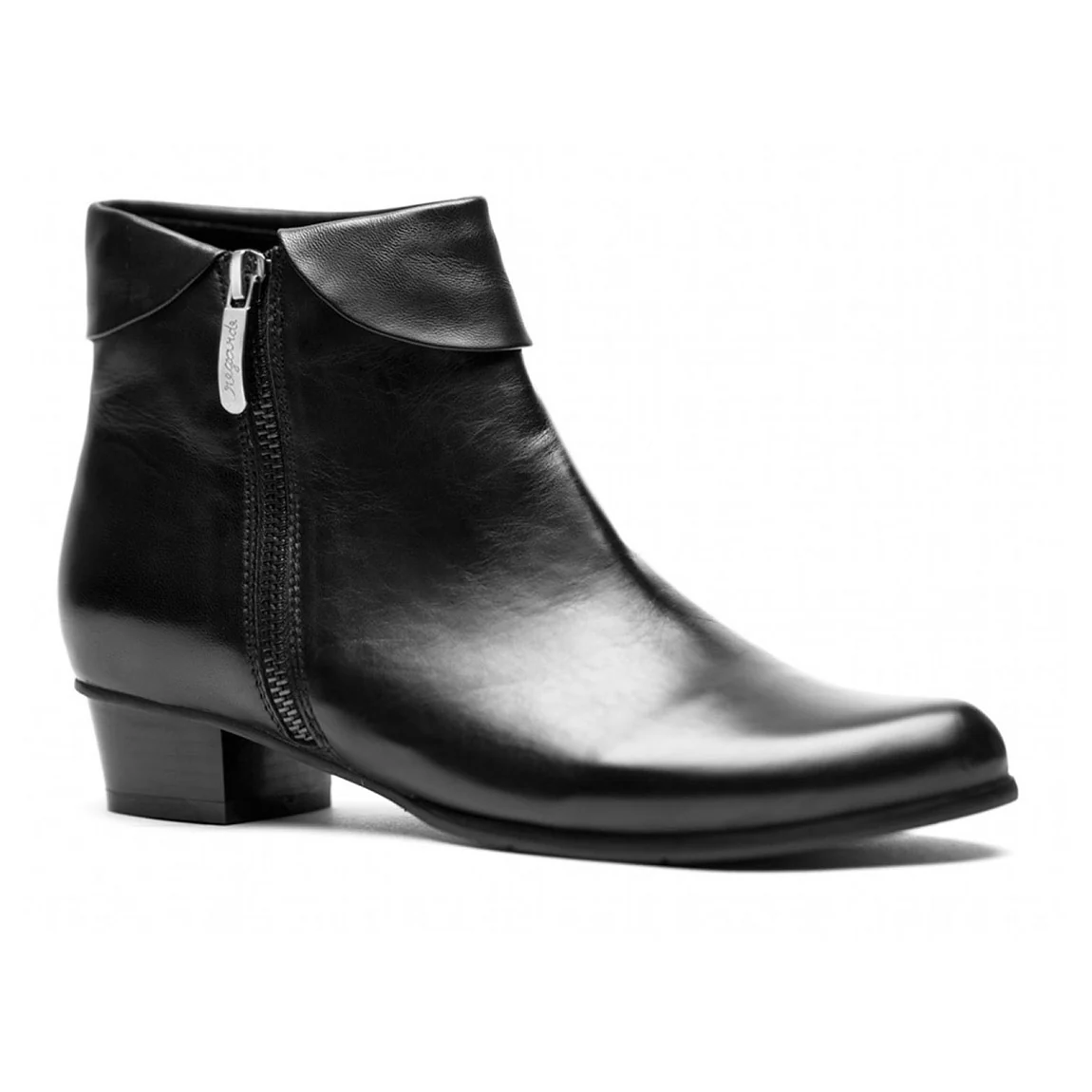 Handcrafted from soft Glove Sangria leather. The Glove leather cuff, material combination, and stitching details are the essence of this ankle bootie. A 30mm block heel. Fully Lined. Geometric cuts. The stitching is accentuated. An inner zipper for fastening. High-density foam and instant-forming memory footbed.